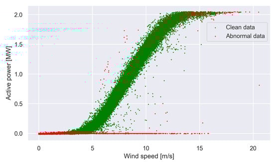 - Removal of measurements deemed outliers: The data are anticipated to exhibit a range of irregularities because these datasets have been automatically recorded by the system. These irregularities can adversely affect the accuracy of operating mode estimations. Therefore, procedures are applied to eliminate measurements deemed to be outliers. More precisely, the following procedures are applied to each wind turbine individually: (1) Exclude data entries that show negative active power values as these indicate times when the turbine is not in operation; (2) Remove data points that exhibit substantial deviation from a two-dimensional binning of wind speed and wind direction. Firstly, a point is discarded if a bin contains only one point. Secondly, remove data points that exhibit substantial deviation from the anticipated active power. The effect of removing these measurements is illustrated in Figure 2.Figure 2. Effect of discarding the abnormal data from the measurements available for the wind turbine R80736 from La Haute Borne wind farm. The removed data points are represented in red, and those retained are represented in green.