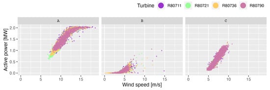 Clustering of the data from La Haute Borne wind farm. In the subfigures (A–C), the titles correspond to the labels of the clusters. Each of the three clusters represents a region of the power curve or, equivalently, an operating mode for the turbines. The scatter plots illustrate a sample of each operating mode from all turbines. In the plots, we use a different color for each turbine (see the legend).