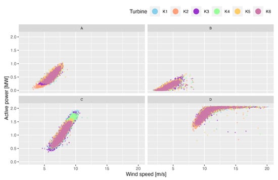 Clustering of the data from Kelmarsh wind farm. In the subfigures (A–D), the titles correspond to the labels of the clusters. Note that the number of clusters is four. All other conventions are the same as in Figure 3.