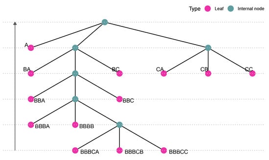 Each such model can be represented as a ternary tree (for illustration, see Figure 5). An interesting property of the tree shown in the figure is that each internal node has exactly three children. We restrict our attention to the family of the trees with this property, which are termed proper trees. We dub this family of trees. Remark in the figure that a label is displayed for each leaf of the tree. Sometimes, the labels assigned to the leaves are called contexts. For instance, let us consider the leaf labeled . To understand the significance of the contexts, we mention that for the tree in the figure, which means that the probability that the current entry of the time series is, for example, the letter depends only on the previous five symbols in the time series. We now consider all the strings of the type . Disregarding the letters from that occur in the positions marked with ♣ and ♠, the probability of observing after such a string is the same because is a leaf. Therefore, we assign to this label (context) two probabilities: the probability of observing in the time series the letter after the string and the probability of observing after . It is evident that one can calculate straightforwardly the probability of observing after if the probabilities above are known. Hence, it suffices to have two parameters for each leaf of the tree. We group in the parameters assigned to all the leaves of the tree T.