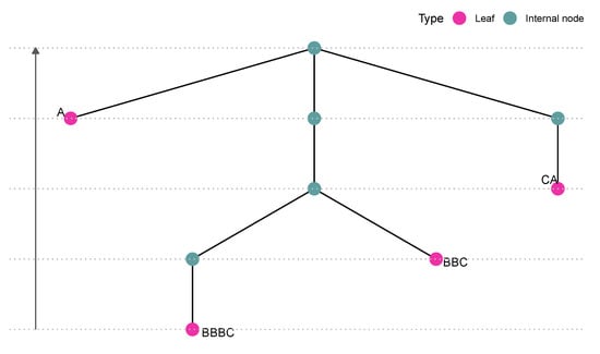 A key point is that there exists a closed-form formula for the marginal likelihood , and it involves the counts for how many times each letter of appears after a certain context in . Interestingly enough, both and can be easily computed by using a version of the context tree weighting (CTW) algorithm [,]. The CTW algorithm firstly builds a tree, say , for which the leaves are all the contexts of length D from . The algorithm comprises a step that guarantees that the resulting tree is proper. Then, all the counts that are needed are computed for each node of the tree. BCT uses the tree built by CTW and visits its nodes from the leaves to the root in order to compute the so-called maximal probabilities for each node of the tree. Then, starting from the root to the leaves, the maximal probabilities are employed to decide for each node if its children are pruned or if they are kept in the tree. The resulting tree is proven to be the MAP tree (or one of the MAP trees in the case when the result is not unique).
