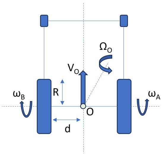 where and are, respectively, the rotational and linear speeds of the point O, which is assumed to be the barycenter of the wheelchair; R is the wheelchair driving wheel radius; and d is the distance between the driving wheels and the point O.
