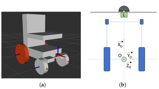 Wheelchair representation (a). In the mathematical representation (b), O is the origin of the system reference; L is the LiDAR source; and , , and are the system axes.