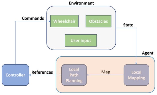 Considering the environment as the union of the wheelchair, the user, and the surrounding obstacles, we considered the system we wanted to design as the components in charge of yielding the correct physical commands to let the wheelchair follow the user input while avoiding the obstacles. Referencing Figure 3, conventional local robot navigation frameworks typically feature a local mapping component that takes sensor readings as the input and produces a local map. Another component, which is commonly known as local path planning, utilizes this local map to generate references guiding the robot to its destination while avoiding obstacles. Subsequently, these references are translated into low-level commands, such as phase current values, through an additional module often referred to as the controller. In our system, both the local mapping and local path planning were replaced by an agent utilizing a DRL method.