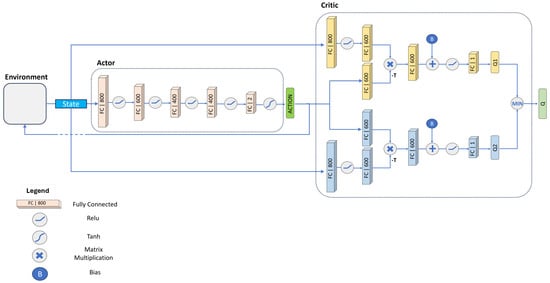 In our scenario, the agent takes the form of a twin delayed deep deterministic policy gradient (TD3) architecture, which was trained within a simulated environment to execute user commands while navigating around obstacles. The TD3 operates as an actor–critic network, enabling actions in a continuous action space. An actor–critic model comprises two networks: the actor and the critic.