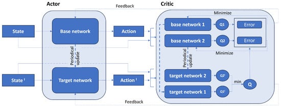Following the actor–critic paradigm, the base actor network is trained based on feedback from the base critic network. However, unlike the base critic networks, the base actor network is not trained at every step but at predefined intervals, justifying the “Delayed” term in the TD3 acronym. Similar to the critics, the target actor network receives only a portion of the updated base actor network. As shown in Figure 6, both actors and critics have a base and target networks. The target networks are updated using the so-called soft update strategy, namely, a small amount of parameters from the base networks is infused into the target ones. The target actor network receives , which is the state recorded during the collection of training episodes and is the resulting state of the application of the action yielded by the base actor network. Hence, the target actor network computes the , which is evaluated by the target critic networks. The two results and , which are the expected cumulative rewards for taking that particular action in that particular state, are compared and the minimum is selected. This Q-value is then used as the ground truth for evaluating the goodness of the estimations done by the two base critic networks. By trying to minimize the error, the base networks are updated. According to the actor–critic paradigm, the actor networks are updated thanks to the feedback provided by the critic networks.