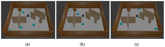 The 10 × 10 maze used for the DRL training phase. Light blue obstacles were randomly placed at the beginning of each episode to help the generalization process. Different positions can be observed in (a–c).