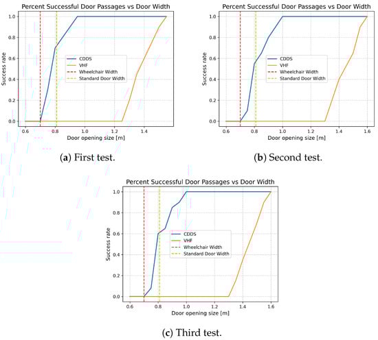 For all of them, as it happened for the first experiment, the aim was to commute from the starting point to the ending one, trying to avoid any collisions. However, this time the testing strategy aimed to compare CDDS and VFH in the traversing of a door opening by varying the door size. The width of the hallway and the standard door size were set, respectively, to 0.91 m and 0.81 m, according to the American Disability Act [118]. The relevant metric was the percentage of successful door traversing against the door width. The first test consisted of traversing the door starting in a obstacle-free condition. Thus, the wheelchair had to follow a straight line to cross it. The second test consisted of traversing the door starting in a corridor. Thus, the wheelchair had to go through the corridor and make a turn at a certain point. The third test consisted of entering a corridor through a door. Thus, the wheelchair had to go toward the door and make a turn to enter the corridor. The results of the experiment can be found in Figure 10.