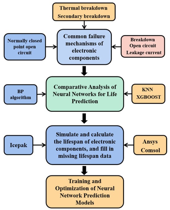 In this experiment, we studied the typical failure mechanisms of capacitive electronic components, and analyzed and compared the principles and applicable conditions of three technologies: a BP multi-layer feedforward neural network, KNN algorithm and XGBOOST algorithm. Based on the impact of simulation errors, we determined which network prediction model to use as the life prediction model. For the simulation of electronic components, we tried two software tools, Comsol 6.0 and Icepak, and finally we chose Icepak for simulation. Comsol is an excellent multiphysics simulation software with versatile capabilities. However, ANSYS 2022 Icepak has the professional capability of multi-physics field coupling, taking into account the influences of heat conduction, convection, radiation, and heat transfer mediums simultaneously. This allows engineers to conduct comprehensive thermal analysis of complex systems, predicting more accurately the temperature distribution and heat dissipation performance of devices. We then tested the actual lifespan of the electronic components and saved the results of each test to create a self-constructed dataset. Finally, the study used self-built data sets as training data to construct three corresponding machine learning prediction models and make predictions. The methods used in the study and the construction process of the data set are shown in Figure 1.
