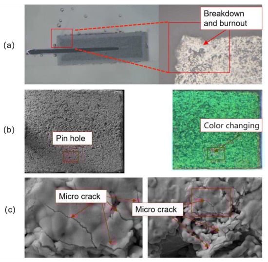 Defect test analysis. (a) Material breakdown and burnout; (b) pin hole with an optical microscope; and (c) micro crack at the defect point.