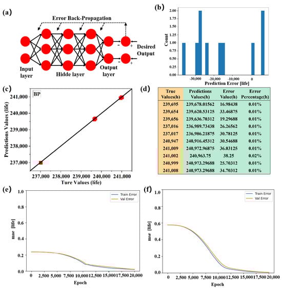 Lifetime prediction of cak45 tantalum capacitor using BP algorithm. (a) Structure diagram of BP algorithm. (b) Error histogram. (c) Prediction results (the red squares represent the predicted values). (d) Prediction error. (e) Mae change curves for the training and validation sets during the training process. (f) Mse variation curves of the training set and validation set during the training process.
