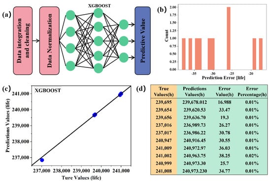 (a) XGBOOST algorithm structure diagram. (b) Error histogram. (c) Prediction results (the blue circles represent the predicted values). (d) Prediction error.