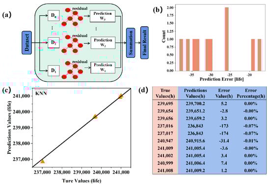 (a) KNN algorithm structure diagram. (b) Error histogram. (c) Prediction results (the orange triangle represents the predicted value). (d) Prediction error.
