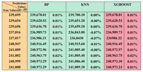 Compared with deep learning, traditional machine learning has the advantages of relatively less data requirements [,,,], low computing resource consumption, and generalization capabilities [,,,]. Among them, the BP (Back Propagation) algorithm [,], KNN (K-nearest neighbor) algorithm [] and XGBOOST algorithm [,,] are popular machine learning algorithms used for different purposes. First, the BP algorithm is an artificial neural network algorithm commonly used for supervised learning tasks such as classification and regression. It minimizes the overall error by backpropagating errors in the network and adjusting the weights of connections between neurons []. Secondly, the KNN algorithm is an instance-based non-parametric algorithm commonly used for classification and regression. It works by finding the k nearest neighbors of a given query point and then predicting a label or value based on the majority vote or average of the neighbors. Finally, the XGBOOST algorithm is a gradient boosting algorithm that has performed well in various machine learning competitions []. It combines multiple weak predictive models (usually decision trees) into a strong predictive model by iteratively adding new models, thereby minimizing the overall error. The algorithm is known for its excellent predictive performance and flexibility in using numerous hyperparameters []. The advantages of using a BP neural network, XGBOOST and KNN algorithms to predict equipment life are as follows: These algorithms can effectively extract features from input data [], handle non-linear relationships, and consider complex patterns in data sets to achieve accurate life predictions []. Additionally, these algorithms can handle both numeric and categorical variables, ensuring robustness and flexibility in the forecasting process [,].