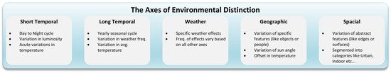 The most common method for dataset generation is session-based sampling with expert annotation occurring at the time of sampling or post-session, with large datasets taking multiple sessions to generate [7]. Due to this, it is guaranteed that environment variables will change, both between sessions and during sessions (depending on collection methods). This issue is exacerbated in image-based data gathering, as the complexity of the data naturally biases the information to the many environment parameters of the sampled area (e.g., an image dataset created at noon during cloudy weather in Ireland will naturally bias the trained network to that time, weather type, and location). Figure 3 describes some of the environment-specific parameters that can affect an image. Each “axis” of variation is based on frequency, time, or location. Even when assisted electronically, sampling the entire gamut of change for multiple environments manually is unfeasible due to an exponential increase in the information needed to be collected and stored and the effort of sampling when considering multiple axes together. This explains why the vast majority of modern autonomous navigation solutions found in the literary review make up partial solutions for only the “spatial” and “geographic” axes [5]. A significant portion of the possible variation in an image is attributed to “short temporal” and “weather” axes, which are unrepresented in most datasets and solutions. With this in mind, this research seeks to resolve this exponential scaling issue through simulation while also exploring these two less considered parameters.