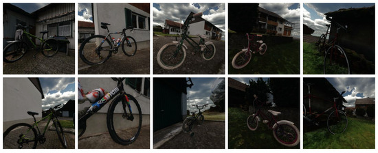For this synthetic dataset to be generated, first it was necessary to gather appropriate 3D-scanned assets fitting the “bicycle” class. This class was chosen specifically due to it being a detectable object by the YoloV3 algorithm and the ease of finding real image datasets and 3D scans of the object. Note that this method is not object-specific and could be completed on any object. For example, canine animals are another popular classifiable object that were considered for testing this method; however, quality 3D scans were harder to find and generally of a lower quality than those of more static objects. For this experiment, five assets were sourced from the same repository as the scene geometry [53,54,55,56]; a description of these assets can be found in Table 1. They represent an acceptable spread of different bicycle types by two defining factors, these being the frame size and tires of the object. Each asset was placed in an independent area within the scene; a visual comparison of each object can be found in Figure 4. It is important to note that while each bicycle is a unique asset, Bike 3 and Bike 4 are the same model of children’s bicycle but in different colours. Once the 3D scans were imported though the user interface, they were configured in a similar fashion to prior research. Area scans that were web sourced were calibrated to match the approximate average size of a European door frame width at 0.8 m, while bicycle assets were scaled to approximately match either an adult- or child-sized bicycle. For ease of operation during the manual collection phase and for future research in autonomous navigation, the simulation was equipped with a UAV drone control scheme from previous work, which was modified with the features needed for location logging. A gamepad input control was included to streamline the manual collection process and enable the rapid generation of new lists of sample locations. For this, a standard Xbox One gamepad device was used, as it has a high similarity to a UAV control transmitter. The control scheme was programmed into the simulation using the Unity Input System, which is preferable as the C# functions are created by the manager and are then applied to any number of chosen control inputs. For example, the horizontal movement function is tied to the left control stick on the gamepad, or the ‘w’, ‘s’, ‘a’, and ‘d’ keys on the keyboard, and can be rebound at any time without rewriting the function. For the dynamic weather system, a popular package was acquired on the Unity asset store [57]. This weather package was chosen for its high level of documentation, its integration with other useful packages for expanded simulator functionality down the line, and for the high level control of time and weather configurations. With this system in place, six different weather configurations were developed for generating a weather-varied and time-varied dataset.