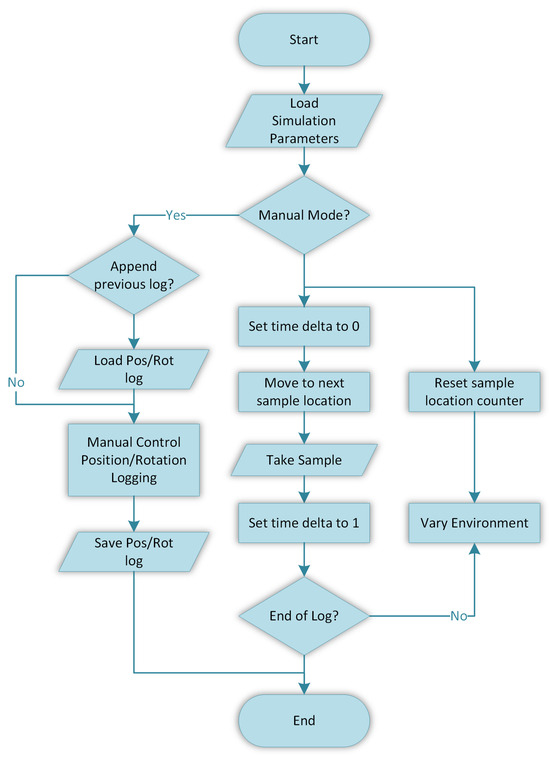 As previously stated, because temporal flow can be adjusted in real time while the simulation is running, it is possible to remove any deviation between samples recorded in different locations within a cycle. Figure 5 is an amended flowchart designed to maximise the benefit of this property and outline the general sampling process. The process consists of a manual phase, which is first used to collect the position and rotations of the camera for each sample, and an automated phase, which moves the camera to each position and rotation, which then generates the images at that iteration. This process then repeats for every iteration defined in the simulation. The result of this process is a dataset that can be sliced in more dimensions than normal manual collection would allow. Prior work [39] used a recording system which manually logged simulation elements such as the drone’s position and rotation for each sample, as well as miscellaneous data such as the sample ID, which was then retained for use over multiple simulations. This approach enables environment variation when generating data while maintaining the same perspectives, since the positional information of the drone is the same between cycles. When generating data through simulation, hardware is often considered as “ideal” (i.e., perfect operation with no sampling delay). This effect is generally considered as a negative trait; however, it can prove advantageous in this use case, since the relationship between the simulation and reality is baked into the dimensions of the already scanned area, and as such there is no need for realistic hardware simulation. Aside from the manual phase of location logging and defining the weather and time configurations, the rest of the process is automated and will run until all samples are generated. For later reference, each sample is tagged with valuable metadata, namely the cycle iteration number and sample ID which is encapsulated in the filename.