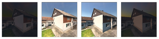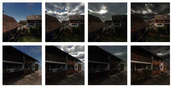 For this round of image generation, a manually defined position and rotation log containing 410 unique positions was iterated over four weather configurations (described in Table 2 and shown visually in Figure 6) and twelve time settings covering a 24 h period, equally spaced at 2 h per setting (see Figure 7). This created a dataset which contains 19,680 images. Each new position in the simulation log creates 48 unique images which are exact to that position but varied in time and weather. This makes it possible to slice the data in ways that are unfeasible in traditional sampling (see Figure 8). As an example of the image total stated above, each slice of the weather axis contains 4920 images, and each slice of the temporal axis contains 1680 images. For the generation of the rotation/position log, consideration was taken to sample at realistic angles and distances, varying from very close (within 1 m of the object) to a “background” distance (approximately 15 m), and angles were varied in terms of pitch to include low-pitch shots similar to a pedestrian photo and high-pitch shots similar to that of a UAV drone or security camera. Additionally, for some images, angles and distances were chosen to include several objects within the frame. As a comparison to this simulated dataset, two additional datasets of real bicycle images were sourced online [58,59] and manually trimmed to create a “day” and “night” image dataset. To minimise the effect of real images whose contexts sit outside the scope of the simulation, the datasets were screened to remove images that did not fit the qualitative criteria (e.g., images of interior environments and exterior environments with excessive artificial lighting, overly stylised images and artistic composites, and images where bicycles were tightly stacked together such as overcrowded bike racks). Since YoloV3 detects multiple objects within a single image, multiple bike images were accounted for in the simulation, and so they were allowed as long as bicycles were not stacked on top of each other. It is important to note that the virtual daylight cycle is out of phase by approximately 2 h, which results in a virtual “sunrise” at 04:00 h and virtual “sunset” at 18:00 h; since the daylight axis is cyclical, this phase shift has no meaningful impact on the results.