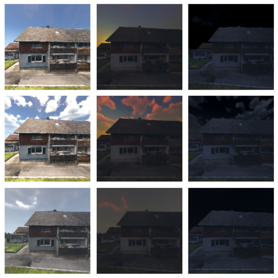 For initial experiments, four equidistant points on the time axis: 6 h, 12 h, 18 h and 24 h, respectively. The resolution of this initial set was too poor to provide an adequate analysis over the temporal spectrum. In order to generate more informative samples, the resolution was increased to 12 equidistant points (2 h between each). Additionally, the imported area mesh contained errors and voids due to missing visual angles when the mesh was created. This issue is considered to be fixable with additional images for a bespoke mesh. However, for online-sourced assets this is unavoidable. Though initially included in prior work, ‘Fog’ and ‘Snow’ weather configurations were not included in the simulation or subsequent simulated datasets due to poor simulation performance and a lack of realistic image samples for comparison; however, more bespoke simulation attempts could consider these elements along with many other environmental factors as variables to be combined with other effects, and as such, this is considered a viable topic for future research. Following analysis, there were some unexpected results which merited investigation into the image data, one such being the rebounding curve in predictions after 18:00 and before 02:00 h, which was expected to lower to a single valley representing the darkest point in the cycle. Upon investigation, this was attributed to an issue within the simulator lighting engine, which caused completely dark scenes to illuminate visibly. This again demonstrates how simulation errors are not inherent, but an issue of implementation caused by the researcher’s skill set or platform limitations. While the lighting issue can be solved through changing some parameters in rendering or the daylight gradient, for this project, the decision was made to minimise changes to account for these issues, as this is a proof of concept to demonstrate that simulations for this application can be effective for testing even with a simulation bias.