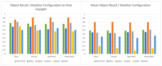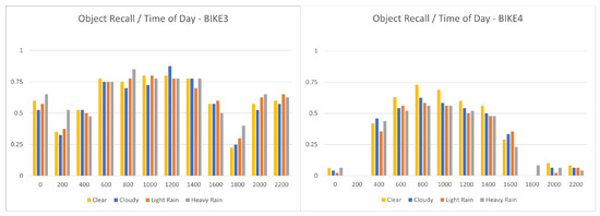 Figure 10 shows the object Recall over the simulated day for Bike 3 compared to Bike 4 at each weather configuration. This result is interesting, as the prediction confidence remains consistent with most objects, such as Bikes 1, 2, 3, and 5, which provided similar curves in most time/weather configurations. The outlier object, however, demonstrates a completely different response over the changing light level to that of what would be expected of a perception-based task at a lower confidence (the prediction drops as it becomes darker and as the weather becomes less clear). This implies that from this simulated test data, the YoloV3 model has lower confidence with certain colours of children’s bicycles and that simulated test data can be potentially used to probe for such weaknesses. Figure 11 shows the results of the harmonic mean recall for the full set over the simulated day/night cycle compared to a baseline of 96% for real images in the day and 56% for real images at night. The simulated results clearly show a performance reduction as the light level in the scene reduces to an average of 32% for the valleys at 02:00 h and 18:00 h. The peak prediction for clear weather can be seen around simulated midday (10:00 h) at 74%. By comparing the delta between the simulated peak and real day image baseline to the delta between the average valleys and the real night image baseline, the domain shift can be calculated for night and day at 24% and 22%, respectively.
