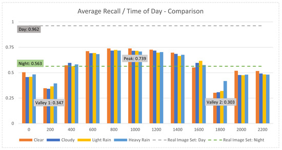 Graph of avg. object Recall by weather variation and time of day, with baselines for night and day real image sets included and simulated peak and valleys labelled for comparison.