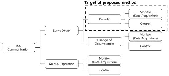 An ICS is constructed with several field and control devices. The measured values are transmitted to the control devices from the field devices, and the control devices change the operation of the field devices using control commands. Most of the traffic is data acquired from the field devices for monitoring. The traffic for control is comparatively rare. Therefore, it is possible to predict incoming network traffic because ICS network communication is static, which is impossible in a general IT network. Network communication in an ICS can be classified as shown in Figure 1.