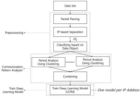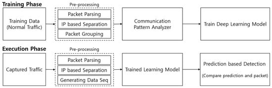 In the training phase, the deep learning model is trained for the detection model. In this phase, data preprocessing and communication pattern analysis are performed to learn the periodic data. In the case of a single communication section, the packet sequence is not affected by the network delay. However, in the case of several communication sections, the packet sequence can be twisted owing to a network delay. To prevent this problem, packets are separated for each communication section, and the packet sequence of each communication section is used for training. Details of the training phase are presented in Figure 3.
