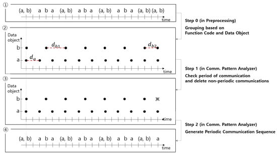 Figure 4 depicts the traffic acquiring a and b data objects over time. ① is the data acquisition details over time in a single communication section, generated via packet separation during preprocessing. Periodicity analysis is difficult because of the data coming in simultaneously. Therefore, grouping is performed based on the function code and data object in step 0. This clearly reveals the periodicity of each datum and helps in the periodicity analysis. As the example deals with only two data acquisitions, ②, which is divided into two parts, is derived. In step 1, from ② to ③, the periodicity of each data object is checked, and aperiodic data are removed. In step 2, a one-dimensional graph (④) that displays only periodic data acquisition is derived by combining all the data objects of the 2-dimensional graph (③) from which the aperiodic transmission has been removed.