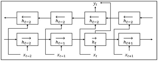 The many-to-one bidirectional LSTM performs a prediction by considering both data arriving before and after, as shown in Figure 5. This is advantageous when learning the pattern of a communication section in which communication with a short period and communication with a long period exist together. When the input sequence () is sequentially input to the model, is output through the forward and backward layers. Because the model is trained such that and have the same value, an abnormality detection is possible by understanding whether and coincide in the execution phase.