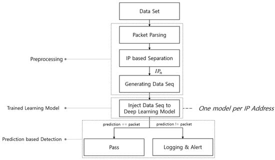 In the execution phase, preprocessed packet data are injected into the learned deep learning model, and abnormal behavior is detected based on the prediction of the deep learning model. The preprocessing is also conducted in the execution phase; however, the step for grouping packets is not performed. Instead, it generates a sequence of packets to be used as an input for the deep learning model. Subsequently, a packet sequence is injected into the deep learning model, and its result is compared with the actual data to determine whether the incoming packet is normal.