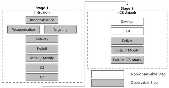 To generate actual abnormal behaviors, we analyzed the ICS Cyber Kill Chain, which is shown in Figure 7 [25]. As ICS operates as a closed network that is disconnected from the outside, direct penetration is difficult. According to the ICS Cyber Kill Chain, the attack targeting the ICS occurs in two stages. In Stage 1, the attacker attacks the vulnerable corporate network connected to the ICS network and gains access rights to the internal network of the ICS. Then, in Stage 2, the attacker directly attacks the ICS using these access rights. Because the proposed scheme in this study aims to detect attacks on the ICS internal network, the attack traffic is generated by focusing on Stage 2.
