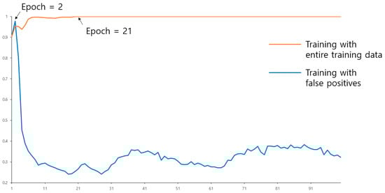 However, since most of our data set was composed of periodic data transmission, we determine that it was possible for the learning of the sequence with entire data. If the model is trained with a large amount of normal data, it is anticipated that small amounts of aperiodic ACKs will have no significant impact on learning from normal data. Therefore, we experimented with two methods: a method to fine-tune the model using the sequences that caused false positives, and another method to training the entire data, including aperiodic data. The relearning results are shown in Figure 8.