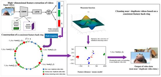 In this paper, an automatic near-duplicate video cleaning method based on a consistent feature hash ring (denoted as RCLA-HAOPFDMC) is proposed to address the above-mentioned issues, which consists of three parts: high-dimensional feature extraction of video data, consistent feature hash ring construction, and cluster cleaning modeling based on a consistent feature hash ring. First, a residual network with convolutional block attention modules, a long short-term memory (LSTM) deep network model, and an attention model are integrated to extract temporal and spatial features from videos by constructing a multi-head attention mechanism. Then, a consistent feature hash ring is constructed, which can effectively alleviate the sensitivity of video data orderliness while providing a condition of near-duplicate video merging. Finally, to reduce the sensitivity of the initial cluster centers to the results of near-duplicate video cleansing, an optimized feature distance-means clustering algorithm is constructed by utilizing a mountain peak function on a consistent feature hash ring to implement automatic cleaning of near-duplicate videos. A commonly used dataset named CC_WEB_VIDEO [5] and a coal mining video dataset [15] are used to confirm the practical effect of our proposed method. The contributions are summarized as follows: (1) A novel consistent feature hash ring is constructed, which can alleviate the sensitivity issue of video data orderliness while providing a condition of near-duplicate video merging. (2) An optimized feature distance-means clustering algorithm is constructed by utilizing a mountain peak function on a consistent feature hash ring to merge and clean up near-duplicate videos. (3) The method presented in this paper is successful on the highly difficult CC_WEB_VIDEO and coal mining video dataset where the coal mining video dataset has complex context scenes.