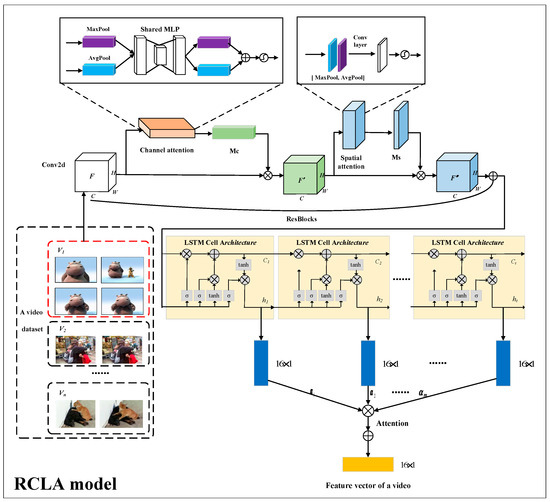 The feature representation of video data is an important stage in the data cleaning process of videos. Currently, several convolutional neural network models have been adopted in the study of image and video data cleaning for feature representation of image or video data, such as AlexNet [35], GoogleNet [35], VGG-16 [36], and ResNet50 [39]. Due to the spatiotemporal features of video data, it is not enough to rely on the above-mentioned convolutional neural network models for spatial feature representations of videos, and the extracted video features are less likely to highlight the spatiotemporal features of salient regions in video data, which will affect the accurate representation of video semantics. To overcome such a limitation, a residual network with convolutional block attention modules is adopted first to extract spatial features of video data. The channel attention and spatial attention modules in these convolutional block attention modules can effectively improve the representation capability of spatial features in the saliency region of video data. Then, the above network and a long short-time memory model are integrated to extract the spatiotemporal features of video data. Finally, to highlight the role of key information in video data on the video semantic representations, an attention model based on the above network models Is Introduced along three independent dimensions of channel, space, and time series to construct a video spatiotemporal feature extraction model with multi-head attention mechanism, which is named RCLA (Resnet-CBAM-LSTM-multi-head attention) model in this paper. The concrete architecture of the RCLA model is shown in Figure 2.