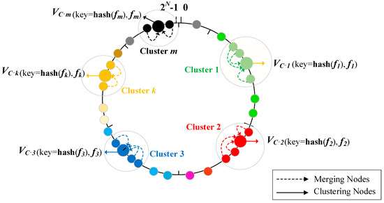 When updating a cluster, the distance between the video hash feature points of the non-cluster centers and all the cluster centers is first calculated. In the K-Means clustering algorithm, all points of non-cluster are divided into the nearest clusters according to the nearest neighbor principle. Unlike the K-Means clustering algorithm, the optimized FD-Means clustering algorithm compares the distances between the video hash feature points of non-cluster centers and all cluster centers. If the minimum distance is not less than the given threshold , the video hash feature points are used as the cluster centers of new clusters; otherwise, according to the nearest neighbor principle, they are grouped into the nearest clusters, and the automatic clustering of video hash feature points on a consistent hash ring is finally achieved, as shown in Equations (17) and (18):