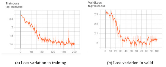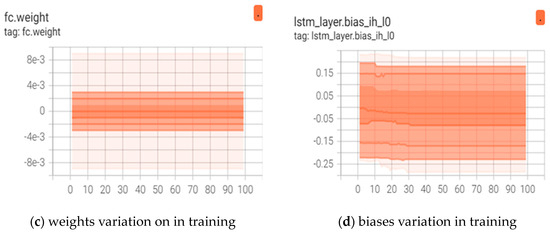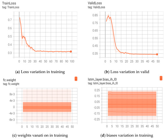 For the CC_WEB_VIDEO and coal mining video datasets, when training the RCLA model, the initialization of weights and bias variables is randomly generated. Moreover, the overfitting problem is solved by the dropout function and parameter-sharing methods, and the loss function is optimized by the Adam algorithm. Figure 4 and Figure 5 show the weight variable changes and training losses in CC_WEB_VIDEO and coal mine video datasets. It can be seen from Figure 4 and Figure 5 that the designed loss function in this paper is converged and that the different weights in the full connection layer of the RCLA model change in the range of −0.003 to 0.003. Moreover, Figure 4 shows that the range of different deviation values is −0.2 to 0.2 and Figure 5 shows the range of −0.24 to 0.2. The above experimental results show that there are no overfitting issues during the training and validation process of the experiment.