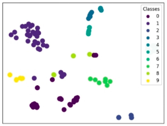 It can be seen from Table 3 and Table 4 that the hand-crafted feature extraction models of spatiotemporal key points and LBoW have limited capabilities to represent the video features in the near-duplicate video detection task. Hence, all indicators are low. After introducing the CBAM module in each residual block, the ability of video spatial feature extraction is improved using the channel and spatial attention mechanisms. Therefore, all indicators are improved compared with the hand-crafted feature extraction models. Since the video data have the spatiotemporal feature, not only the LSTM deep neural network in the RCLA model is used to extract the temporal feature of the video data, but also the standard attention mechanism is used to enhance the feature representation of the local regions of the near-duplicate video data. Thus, the near-duplicate video can be accurately identified, and the indicators are generally high, but the recall indicator is lower than that of the spatiotemporal keypoint model. It is considered that the spatiotemporal keypoint model can extract the spatiotemporal feature of video data, and the number of detection results is enormous, where the number of correct near-duplicate video data is also massive. Hence, the recall indicator of the spatiotemporal keypoint model is high, but the precision and accuracy indicators are low. On this basis, taking the coal mine video dataset as an example, this paper visually shows the clustering results of 10 types of near-duplicate video data, as shown in Figure 7.