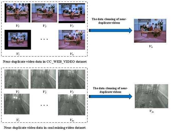 At present, the traditional image or video data de-duplication methods tend to retain the first detected data and remove other near-duplicate data in an ordered sequence, but such methods are randomized at different settings of sequence length, which will lead to fluctuations in the results of data cleaning. Hence, a video in a cluster cannot be arbitrarily selected as a seed video or representative video to be reserved. In this paper, the video data corresponding to the cluster centers are the representative video data to be retained, and others in the clusters are deleted, as shown in Equation (19):