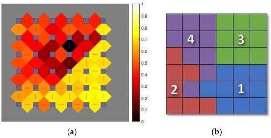 Figure 1a shows the visual representation of the U-Matrix. The K-means method was then used to generate the data classes (from Class 1 to Class 4), as shown in Figure 1b []. For the K-means algorithm, the parameterization was also set to the default used by MATLAB. The maximum number of iterations was set to 100, centroid initialization was randomly adjusted using the ‘sample’ method, and the Euclidean distance as the distance metric.