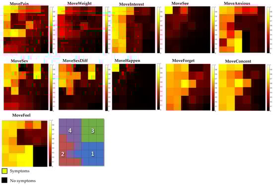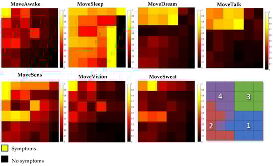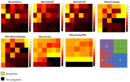 The component map is a convenient type of SOM visualization for analyzing the distribution of each patient symptom across a map. These maps should be interpreted according to the color scale, where yellow corresponds to the presence of the symptom and black indicates its absence. In addition, the symptoms are categorized according to the class in which the neurons were activated. Class 1, also known as the ‘Initial Stage’, represents the early stages of a disease. At this stage, symptoms can be subtle or almost unnoticeable. Some individuals in this class may not even have the disease, but are included because they have a few signs or symptoms. Class 2, labeled the ‘Intermediate Stage’, describes progression beyond the initial stage, but before reaching more serious levels. Class 3, labeled the ‘Advanced Moderate Stage’, indicates a more advanced phase of the disease, but before the more severe stages. Class 4, named the ‘Advanced Stage’, represents a significant progression of the disease, characterized by a more profound impact on quality of life.