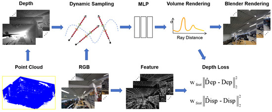 Figure 1 shows the general framework of our method. First, we input the point cloud and process it by projecting the point cloud to generate a depth map (Section 3.1). Then, we input the image and use the depth information for dynamic sampling (Section 3.3), which is then fed to the MLP for training. At the same time, we extract the corresponding feature maps from the image and weight the feature information with the depth loss (Section 3.4). Finally, the image from the novel view is rendered. Our output image and depth map can be used to generate a high-quality point cloud (Section 3.5).