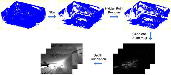 The data preprocessing process consists of several steps. Firstly, the collected dense point cloud is filtered to remove any noise and moving objects. Next, we filter out any regions of the point cloud that are not visible due to occlusion in the current viewpoint using the hidden point removal method based on the camera position. Then, we project the point cloud to obtain the corresponding depth image. Finally, we improve the depth completion method and use it to obtain the final depth map. Note that our input point cloud is colourless and is therefore represented in blue for ease of display.