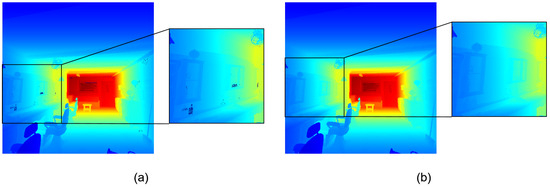 Finally, as the depth maps after the above processing are sparse and there are many places where the true depth values cannot be displayed, we have enhanced the depth completion method [48] to fill in the missing values in the generated depth maps. It is worth noting that such processing can cause the depth map to become blurred at the edges, making it difficult to retain detail. Therefore, we made a small but critical change to the depth completion method so that it only changes the empty areas in the depth map that originally had a depth value of 0. This processing significantly improved the quality of our depth maps. A comparison of the visualisation before and after depth completion is shown in Figure 3.