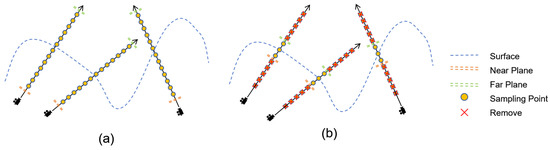 (a) The original NeRF sampling method is used for wide range sampling without depth priors. (b) A dynamic sampling approach is employed, which removes several sampling points away from the object’s surface and only acquires sampling points near it.