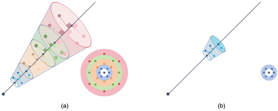 Here we show a toy 3D ray with an exaggerated pixel width (viewed along the ray as an inset). (a) It is divided into 4 frustums denoted by colour. We multisample each frustum with a hexagonal pattern. (b) It is intercepted by the depth information and only a shorter part of it remains. We multisample this part with a hexagonal pattern.