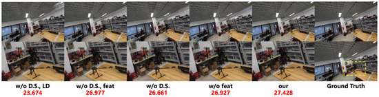 The ablation study clearly shows that the omission of dynamic sampling and depth loss leads to significant blurring and ghosting. Additionally, the lack of dynamic sampling methods results in a large number of invalid samples, which significantly impacts convergence speed and hinders the generation of high-quality rendered images within a short period. And, the absence of depth loss causes a focus solely on image information, disregarding depth information that could serve as a constraint. Furthermore, utilising a simple depth loss function without incorporating feature weights can result in indistinct occlusions near occluded objects and loss of detail due to the overbearing influence of depth information. As a result, it is imperative to differentiate the reliability of depth information in various regions by incorporating feature weights. Additionally, neglecting dynamic sampling methods increases the distance between sampling points and affects the convergence of the model. This can also make it difficult to accurately estimate the surface location of objects, resulting in blurred rendered images and the appearance of airborne floaters in the scene. If feature weights weighted according to depth loss are not used, some details may become blurred due to a possible lack of accurate depth information. Additionally, smoothed regions that should be more dependent on depth information may have uneven colours due to the excessive influence of the image.