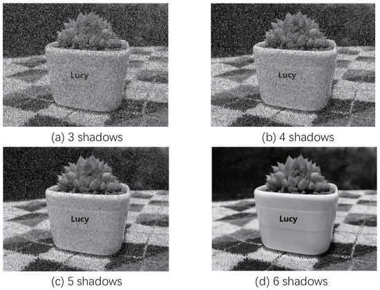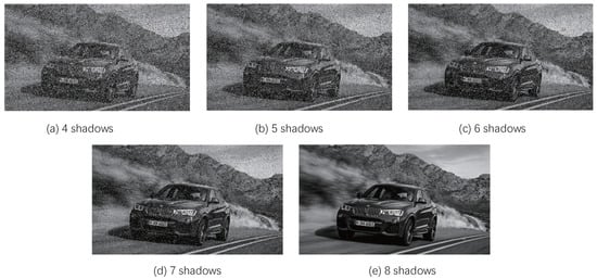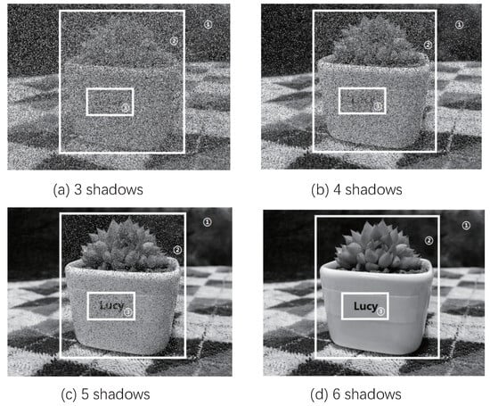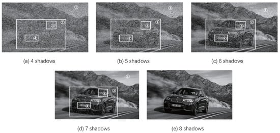 In experiment 2, two PSIS schemes were used, a previous PSIS scheme and our proposed PSIS scheme. In both schemes, the original image was encrypted into shadows; 3 to 6 shadows can gradually reconstruct the image using the previous PSIS scheme. In our proposed PSIS scheme, the original image is first segmented into four regions with different importance levels, and then shadows are generated using our approach. During image reconstruction, each region can be gradually reconstructed from 4 to 8 shadows, but the same number of shadows can recover less information about a region with a higher importance level. Figure 3 and Figure 4 show the results of the image reconstruction using the previous PSIS and proposed PSIS schemes, respectively, and the percentages of the recovered image and each recovered region are listed in Table 2. Normally, the selection of parameters k and n depends on the specific application scenarios of secret image sharing. The parameter n is determined based on the number of users, and the parameter k is half or a little more than half of n, which matches the majority principle. In the experiments of this work, the images are simple, and we assume that there are few participants. However, in some large-scale application scenarios, the parameters of k and n can be in the hundreds or even larger than that.
