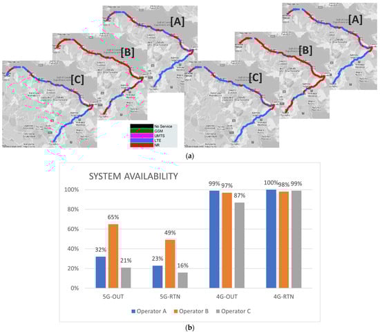 Figure 1a shows the actual measurement route on a map, colored according to the system availability (red: 5G, blue: 4G, green: 2G), for each of the three Greek operators, A, B and C, for the trip Tripolis–Patra (left) and the return trip Patra–Tripolis (right). Note that the maps for the three operators are overlapping. Figure 1b shows the bar chart for the 5G/4G system availability for the three operators for the route Tripolis–Patra (OUT) and Patra–Tripolis (RTN).
