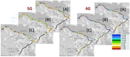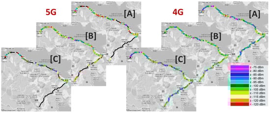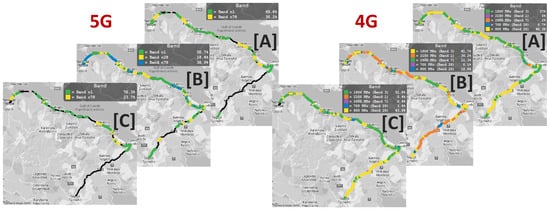 Figure 2, Figure 3, Figure 4 and Figure 5 show the colormaps for RSRP, RSRQ, SINR, and frequency bands, for the three operators and the two systems, respectively. Although these figures are good for visualization purposes, a more detailed analysis of RSRP, RSRQ, and SINR is presented in the following section. For the frequency bands, it has to be mentioned that for 5G, bands n28 (700 MHz), n1 (2100 MHz), and n78 (3500 MHz) were used throughout the whole route. For 4G, band 28 (800 MHz), band 20 (MHz), band 3 (1800 MHz), band 1 (2100 MHz), and band 7 (2600 MHz) were used. Each of the three operators utilizes the n78 band for 20% to 40% of their deployments. It has been observed that within these n78 frequency bands, 5G performance is inferior to that of 4G. This performance discrepancy is expected since the 5G Non-Standalone (NSA) architecture utilizes the existing 4G site infrastructure, which is optimized for higher frequency bands. As a result, the performance of the network is significantly dictated by the allocation of specific frequency bands.