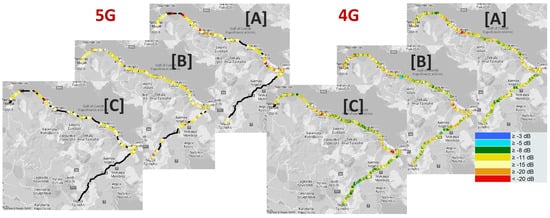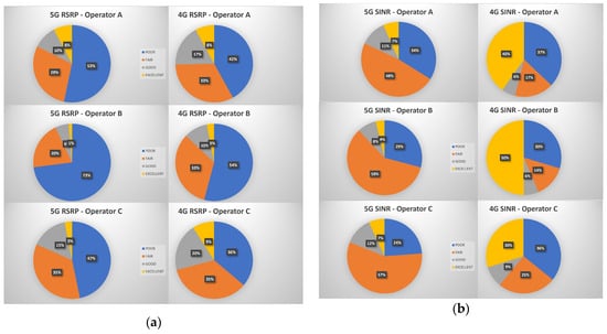 Following this line of thought, Table 4 shows the statistics for the “original” or outward measurement route, for the three operators and both 5G and 4G networks. For better visualization, Figure 7 also shows pie charts for the RSRP and SINR.